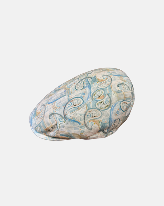 Flatcap Leinen Beige/Blau mit abstraktem Muster